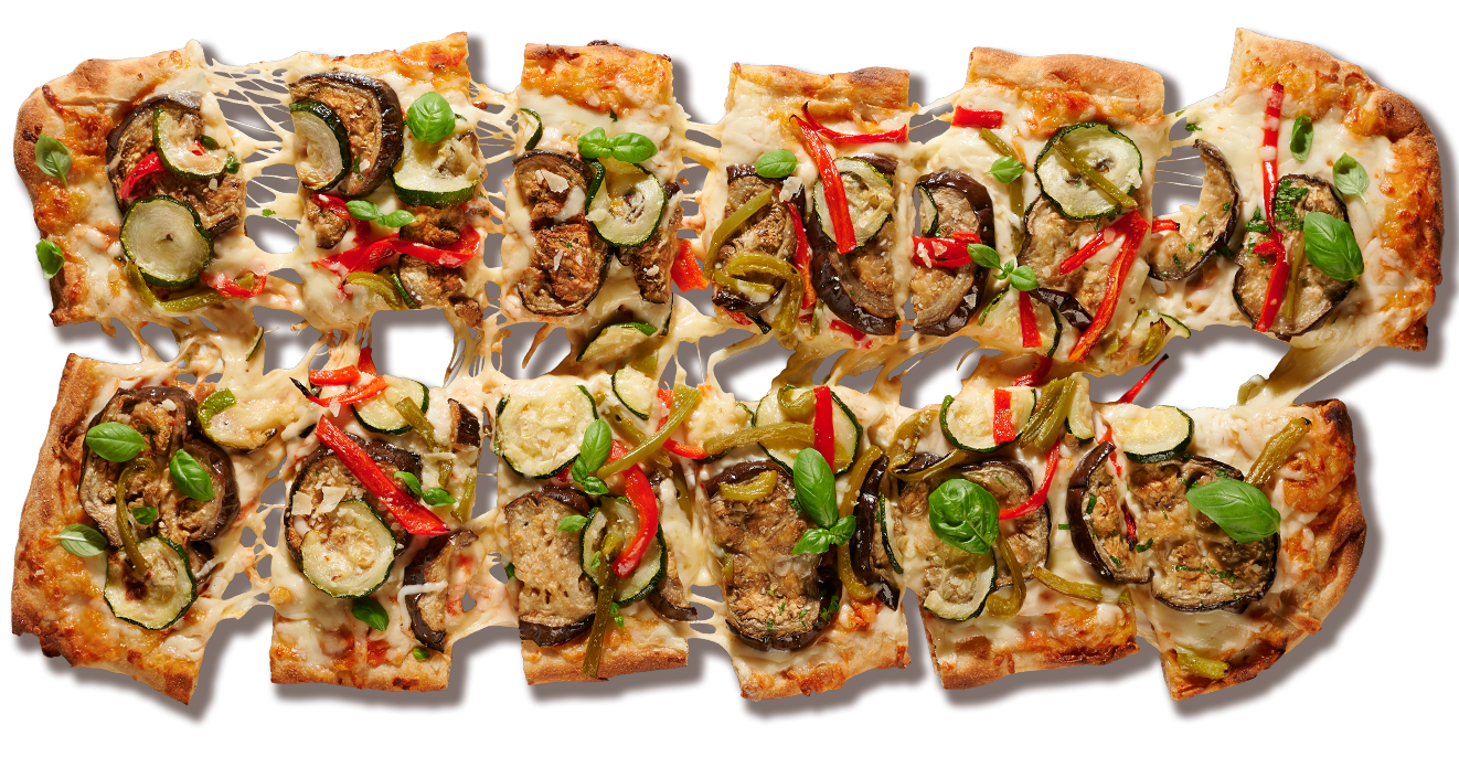 Freshly roasted eggplant, zucchini, and mixed peppers topped with 24-month aged parmesan, layered over creamy mozzarella and Italian tomato sauce on VABBÈ's specialty Roman-style crust.